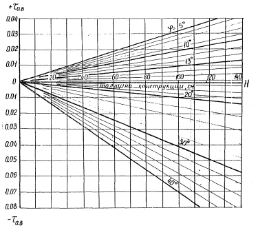 По номограмме рис. 2 приложения 9 определяют активные напряжения сдвига в грунтовом основании от нагрузки: τам = 8,5×0,0163 = 0,138 кгс/см2. По номограмме рис. 5 приложения 9 определяют активные напряжения сдвига от собственного веса конструкции: τав = 0,006 кгс/см2. Максимальные суммарные активные напряжения сдвига в грунте τам + τав = 0,138 + 0,006 = 0,144 кгс/см2. Предельное сопротивление сдвигу в грунте при N = 34 прохода K·С = 1,19×0,12 = 0,143 кгс/см2, где K = 1,19 - комплексный коэффициент, определяемый по табл. 2 приложения 9. Перенапряжение