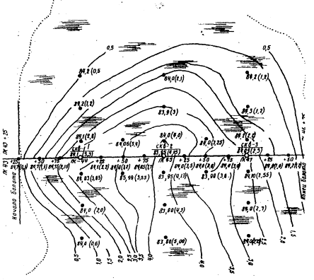 х) К 1 типу относить при R < 25 % хх) Для уточнения типа необходимы лабораторные испытания на сдвиг и компрессию. 4. Общие задачи инженерно - геологического обследования болот при изысканиях дорог. Состав работ. Отчетная документация4.1. Целью инженерно-геологического обследования болот при изысканиях дорог является получение данных, необходимых для обоснования окончательного проложения трассы и назначения конструкции и технологии сооружения земляного полотна. 4.2. При инженерно-геологическом обследовании болота необходимо: а) установить границы болота в пределах зоны возможного расположения трассы; б) выявить строение слабой толщи (ее стратиграфические особенности) и характер дна болота (вид пород и рельеф); в) установить физико-механические характеристики грунтов, слагающих слабую толщу, необходимые для определения строительного типа болота, типа основания по устойчивости и расчета конструкции насыпи; г) выявить особенности гидрологического режима болота, 4.3. Для получения требуемых данных (п. 4.2) выполняются следующие работы: а) топографическая съемка болота; б) проходка зондировочных и опорных скважин с отбором проб грунтов нарушенного и ненарушенного сложения и испытание грунтов в условиях их природного залегания (без отбора монолитов); в) лабораторные испытания проб грунтов нарушенного сложения с определением основных показателей состава и состояния грунтов и испытания монолитов для определения характеристик механических свойств грунтов (параметров, характеризующих сопротивляемость сдвигу, сжимаемость и скорость уплотнения грунта); г) камеральная обработка материалов обследования с составлением отчетной документации. 4.4. Отчетная документация оформляется в виде паспорта, включающего: а) план болота с изолиниями мощности слабой толщи (рис. 1); б) геологические разрезы по оси вариантов трассы и по поперечникам с нанесенными на них результатами определения основных показателей состава и состояния грунтов и механических испытаний грунтов в условиях природного залегания полевыми приборами (рис. 2); в) результаты лабораторных испытаний грунтов слабой толщи; г) пояснительную записку. Пояснительная записка должна содержать: подробное описание болота, включая его происхождение: источники питания; состав и состояние грунтов слабой толщи; данные о растительно-корневом покрове болота, пнистости, наличии поверхностного водоотвода; данные о постоянных водотоках и о проходе весенних вод; данные о характере пород, слагающих дно болота и о рельефе последнего.