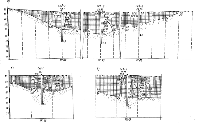 Рис. 2. Геологические разрезы по трассе: а - продольный разрез по оси дороги; б, в - поперечный разрез; ▼ - отметка устья скважины, Расстояния между скважинами 25 м В пояснительной записке дают оценку строительных свойств болотных грунтов; выделяют расчетные (однотипные) участки, расчетные слои (т.е. слои единообразные по инженерно-геологическим свойствам) и дают расчетные значения механических характеристик грунтов для этих слоев. На основе количественной оценки механических свойств грунтов слабой толщи должна быть проведена предварительная оценка слабой толщи как основания насыпи. Для, упрощения такой оценки при глубине болота не более 6-8 м и условиях нагружения указанных в пп. 3.3 настоящих Методических указаний может использоваться строительная типизация болотных грунтов и строитель пая типизация болот. Пояснительная записка должна содержать также сведения о по вед елки, и состоянии существующих дорожных насыпей, расположенных в пределах данного болота, состоянии земляного полотна, конфигурации основания насыпи по данным бурения, качественной оценке грунтов тела насыпи и т.д. Должны быть приведены сведения о резервах грунта, намечаемых для использования при возведении насыпи на болоте, с указанием характеристик этих грунтов. 4.5. В результате обобщения всех данных, обследования должно быть сделано заключение о принципиальной возможности или невозможности (нецелесообразности) использования слабой толщи в качестве основания и указаны наиболее целесообразные конструкции, которые могут рассматриваться в качестве конкурирующих вариантов при дальнейшей разработке проекта. 4.6. Состав и объем работ, выполняемых при обследовании, методика их выполнения и применяемые способы определения свойств грунтов и аппаратуре зависят от стадийности и этапа изысканий. 5. Порядок проведения инженерно - геологических обследований5.1. Инженерно-геологическое обследование следует выполнять поэтапно. Этапы обследования отличаются друг от друга методикой определений и составом работ. При этом каждый последующий этап как по методике определений, так и по применяемому оборудованию и составу определений более сложен и трудоемок, чем предыдущий. Целесообразно выделять три этапа обследования. На первом этапе (рекогносцировочном) лабораторных определений не выполняют. На втором этапе лабораторные исследования ограничиваются определением показателей состава и состояния грунтов в потевой (нестационарной) лаборатории. На третьем этапе выполняют испытания в стационарной лаборатории для определения показателей механических свойств грунтов. 5.2. В зависимости от конкретных условий проектирования указанные этапы обследования могут быть распределены по стадиям проектирования. При двухстадийном проектировании (технический проект и рабочие чертежи) целесообразно первые два этапа обследований проводить на первой стадии проектирования, а третий этап - на второй стации. 5.3. Количество этапов обследование и состав работ уточняют по мере обобщения результатов предшествующего этапа. Первый этап обследования 5.4. На первом этапе обследования до проведения полевых инженерно-геологических работ изучают карты и предварительно полученные аэрофотоматериалы. Использование аэрофотоматериалов особенно важно при значительных размерах болот, пер