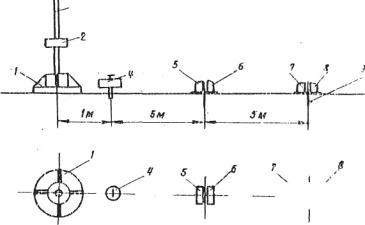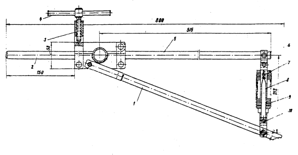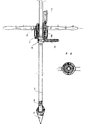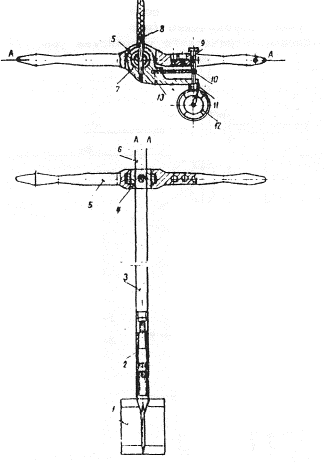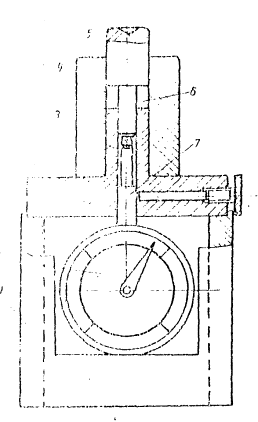 1 - подставка, 2 - индикатор, 3 - нижний шток; 4 - втулка; 5 - верхний шток; 6 - испытываемый грунт; 7 - зажимный болт