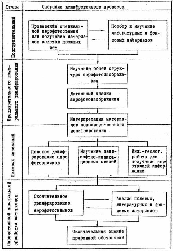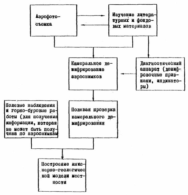 Рис. 2. Структурно-технологическая схема дешифровочного процесса В задачу второго этапа входит составление предварительных инженерно-геологических карт по данным камерального дешифрирования аэроснимков с использованием аэарофототеки и всех имеющихся литературных и фондовых материалов. Камеральное дешифрирование начинают с изучения внешних особенностей ландшафта и выявления тех из них, которые в конкретной природной обстановке могут служить индикаторами определенных инженерно-геологических условий. Указанная работа включает два взаимосвязанных действия, заключающихся в выделении однородных по аэрофотоизображению контуров (элементаризация) и дешифрировании их содержания, т.е. опознании внешних компонентов ландшафта и отдельных его объектов (декодирование). Далее выполняют интерпретацию инженерно-геологического содержания контуров с помощью выявленных индикаторов инженерно-геологических условий. В процессе камерального дешифрирования намечают новые индикаторы и дешифровочные признаки, которые подлежат проверке и обоснованию при планируемых полевых обследованиях. По материалам камерального дешифрирования составляют предварительную инженерно-геологическую карту, а при слабой изученности индикационных связей - ландшафтно-ситуационную, на которой показывают особенности внешнего строения ландшафта без характеристики инженерно-геологических условий. Достоверность таких карт высокая и зависит от степени изученности территории и квалификации дешифровщиков. При полевых изысканиях осуществляют: а) проверку предварительных инженерно-геологических карт и их уточнение; б) полевое дешифрирование аэроснимков для проверки использованных индикаторов и дешифровочных признаков и выявления новых; в) изучение физико-механических свойств грунтов и сбор другой информации, которая не может быть получена непосредственно по аэроснимкам. Наземные полевые работы выполняют, в зависимости от стадии проектирования, только выборочно (на опорных маршрутах и на ключевых характерных участках) или на всем протяжении изучаемых вариантов. Опорные маршруты устанавливаются так, чтобы они пересекали все основные элементы ландшафта и обеспечивали повторность в изучении каждого из них. Ключевые участки выбирают по предварительным картам и располагают на каждом характерном аэроландшафте. На последнем этапе изысканий проводят окончательное дешифрование аэроснимков с учетом результатов полевого дешифрирования и изучения индикаторов инженерно-геологических элементов местности и ах дешифровочных признаков, анализируют все имеющиеся материалы и составляют окончательные инженерно-геологические фотосхемы и карты. По ним определяют инженерно-геологические условия строительства и прогнозируют их изменения при строительстве дороги. В зависимости от полноты аэрофототеки и требований, предъявляемых к инженерно-геологическим материалам на разных стадиях проектирования, рассмотренная схема может модифицироваться. Так, предварительную оценку инженерно-геологических условий всего района изысканий проводят камеральным дешифрированием имеющихся аэроснимков с использованием эталонных снимков аэрофототеки и фондовых материалов, без производства работ по полевому дешифрированию. На изысканиях для технико-экономичес