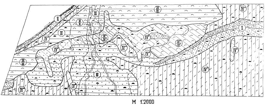То же (при камеральном районировании) Инженерно-геологический вид или разновидность отложений с указанием общей мощности, строения по разрезу и мощности I-II слоев от поверхности (при районировании по полевым материалам) |