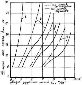 или меньше действительного коэффициента фильтрации К = 3 м/сут. Таким образом, при устройстве сопутствующего дренажа мелкого заложения даже в одну нитку можно применить и местный дешевый мелкозернистый песок. 5. Расчет дренирующего слоя по методу поглощения. Предположим, нет труб, но строительство обеспечено транспортными средствами для перевозки песка. В районе строительства имеется дешевый местный мелкозернистый песок, модуль его упругости, как и ранее требуемый, из условия прочности должен составлять E1 = 1050 кг/см2. В соответствии с расчетным графиком при этой величине E1 значение hзап равно 0,34 м. Воспользуемся уже известными формулами (см. §§ 9 и 19):