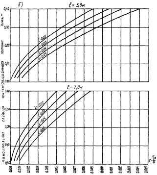Примечания. 1. Коэффициент фильтрации определен по методике Союздорнии. 2. В числителе указано поглощение песчаным слоем воды в свободном состоянии (q3-q1), в знаменателе - в капиллярном состоянии (q2 - q1). 3. Меньшие значения водопоглощения относятся к 3 типу увлажнения местности, большие - ко 2 типу. 4. dэф - под эффективной или действующей величиной грунтовых зерен понимается максимальный диаметр тех фракций, количество которых составляет 10 %. 5. КН - Коэффициент неоднократности характеризует отношение диаметра фракций, составляющих 60 %, к эффективному диаметру. Приложение 4Примеры расчета дренирующего слояИсходные данные. Автомобильная дорога проходит по косогору в полунасыпи-полувыемке во II климатической зоне. Грунт-тяжелая супесь (группа А). Тип увлажнения местности - 3-й. Пески мелкозернистые с коэффициентом фильтрации К=3 м/сутки и высотой капиллярного поднятия hk = 0,5 м, стоимостью 2,2 руб./м3, и среднезернистые с К= 8 м/сутки, hк=0,35 м и стоимостью 4 руб./м3. Ширина проезжей части В=7 м и обочин b=3 м. Поперечный уклон корыта i = 0,02. Толщина дренирующего слоя из условия прочности с проектным модулем упругости E1 = 1050 кг/см2 установлена равной hg = 30 см. Требуется проверить, удовлетворяет ли принятая толщина дренирующего слоя условию осушения. В соответствии с табл. 1 для конкретных природных условий находим общий приток воды за расчетный период, равный Q = 60 л/м2, и удельный q = 3 л/м2 сутки. 1. Рассчитать требуемое значение коэффициента фильтрации песка, пригодного для устройства дренирующего слоя Проверим возможность использования местного песка. Пользуясь расчетным графиком (см. рис. 1), при E1 = 1050 кг/см2 для мелкозернистого песка находим hзап = 19 см. Тогда допустимая глубина фильтрационного потока в дренирующем слое не должна превышать hmax = hg - hзап = 30-19 = 11 см. Поскольку дорога проходит по косогору, примем односкатный поперечный уклон i = 0,02, обращенный в нагорную сторону. В этом случае путь фильтрации l = 7 м. Тогда при hmax = 11 см в соответствии с номограммой: (рис. 2 б)