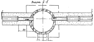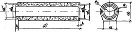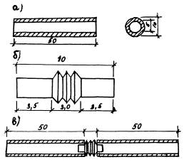 Рис. 6. Конструкция керамзитобетонных трубофильтров диаметром d = 50 мм: а) - разрезы звена; б) - общий вид полиэтиленовой муфты-вкладыша; в) - стык двух звеньев при помощи муфты-вкладыша Фальцевые соединения являются менее совершенными, чем соединения с применением муфт-вкладышей. § 25. При использовании в агрессивных средах звенья трубофильтров предварительно опускают в горячий битум БНД-60/90 для создания защитного слоя из органического вяжущего. § 26. С цепью повышения срока службы грубофильтров в агрессивных средах вместо цемента в качестве вяжущего применяют жидкое стекло (при керамзитовом заполнителе), с последующим его обжигом, или синтетические смолы (например, эпоксидные). § 27. Гончарные трубы изготавливают с длиной звена 330 мм и диаметром 50, 65, 75, 80, 100 мм и более. С увеличением диаметра труб снижается качество изготовления и возрастает процент их боя при перевозке и укладке на месте. Желательно применять самоцентрирующиеся гончарные трубы, что предупреждает боковое смещение и гарантирует надежное скрепление стыков. Вода в гончарные трубы поступает через стыки. § 28. Асбестоцементные трубы в СССР изготавливают диаметром не менее 80 мм с длиной звена 3 м. Повышение водоприемной способности дрен связано с перфорированием асбестоцементных труб. Диаметр водоприемных отверстий не должен превышать 5-6 мм. Их просверливают в нижней половине трубы по два ряда с каждой ее стороны в шахматном порядке через 40-50 мм. С той же целью через каждые 30-60 см делаются пропилы, равные 0,4 d (где d - диаметр трубы). Ширина пропилов - не более 1,5-2 мм. § 29. Пластмассовые трубы изготавливают двух типов: гибкие (шланги) - полиэтиленовые и жесткие (трубы) - поливинилхлоридные. При тонких стенках пластмассовые трубы характеризуются малой жесткостью и потому необходимо применять гофрированные пластмассовые трубы с ребрами жесткости. Вода в пластмассовые трубы поступает через круглые или щелистые водоприемные отверстия шириной не более 2 мм. § 30. Выбор труб для устройства дрен зависит от возможности их получения и условий работы дренажей (агрессивность среды). § 31. Наиболее дешевыми являются керамзитовые трубофилътры. Трубофильтры, изготовленные на основе жидкого стекла, не подвержены действию любых химических агентов. Морозостойкость всех перечисленных труб достаточна для устройства дренажей мелкого заложения, располагаемых обычно в зоне сезонного промерзания. Надежность и долговечность дренажа при гончарных, асбестоцементных и стеклянных трубах зависит от качества фильтровых обсыпок. Пластмассовые трубы серийно изготавливают с самозащищающимися водоприемными отверстиями, тогда нет надобности в устройстве фильтровых обсыпок. § 32. В районах с промерзанием земляного полотна глубже 0,8 м следует применять трубы d ≥ 80 мм, а в более южных - d ≥ 50 мм. § 33. На участках с откосами земляного полотна, 1:3 и полос целесообразно устраивать трубчатые воронки и поперечные прорези мелкого заложения с применением асбестоцементных труб. Длина каждого звена составляет 3 м, и потому крайнее звено при сопряжении с откосом земляного полотна является более устойчивым, чем при коротких звеньях (например, в гончарных трубах или трубофильтрах). III.3. Сброс воды продольными трубчатыми дренамиIII.3.А. Конструкции дрен§ 34. На участках с количеством воды q ≥ 2,5 - 3 л/м2 в сутки, поступающей в 