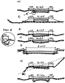 Рис. 7. Конструкция, дренирующего слоя, осушаемого продольными трубчатыми дренами: а) - в нулевых местах при ширине покрытия В>6 м с устройством углубленных ровиков; б) - в насыпях при ширине покрытия В > 6 м с устройством углубленных ровиков; в, г) - в нулевых местах при ширине покрытия В < 5,5 м; д - в населенных пунктах В ≥ 7,5 м с устройством углубленных ровиков; е) - на косогорах при ширине покрытия В<7,0 м; ж) - на пригородных дорогах при ширине В > 6 и с устройством углубленных ровиков На участках с двускатной проезжей частью шириной В ≤ 5,5 м возможно устройство продольной дрены по ее оси. Поперечный уклон корыта принимают i ≥ 3 %. § 37. Продольные дренажи мелкого заложения, как правило, устраивают под покрытием проезжей части. При наличии бетонных краевых полос устройство дрен допускается и под ними. § 38. Для удаления воды из продольных дренажей мелкого заложения устраивают поперечные сбросы по возможности чаще, но не реже, чем через каждые l = 250 - 300 м (рис. 8). Сбросы также надлежит устраивать в местах вогнутых вертикальных кривых и сопряжения перестроенных участков с неперестроенными.