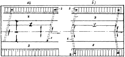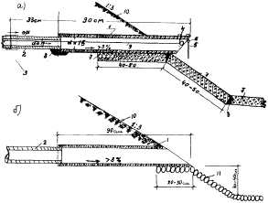Рис. 8. Схема возможного размещения поперечных сбросов воды При применении труб с короткими звеньями в пологих откосах земляного полотне требуется укладка крайнего звена из бетонной или асбестоцементной трубы, d = 150 мм. На мокрых и сырых залесенных участках со значительным расходом воды следует применять конструкцию сброса, показанную на рис. 9 а. Если трава на откосах земляного полотна регулярно скашивается, то нужно применять крайнее звено со скосом (рис. 9 б).