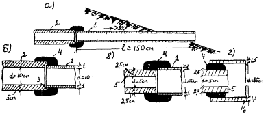 Рис. 11. Конструкции сопряжения трубофильтров с асбестоцементной трубой: а - продольный разрез; б - деталь сопряжения звена трубофильтра d = 10 см, имеющего торцевые фальцы с асбестоцементной трубой; в - то же, но звено трубофильтра d = 5 см с асбестоцементной трубой d = 10 см; г - то же, но с асбестоцементной трубой d= 15 см (1 - асбестоцементная труба, 2 - трубофильтр, d = 10 см; 3 - торец трубофильтра; 4 - заделка бетоном; 5 - трубофильтр с плоскими торцами d = 5 см; 6 - асбестоцементная труба d = 15 см) § 39. При наличии водосточной сети воду из продольных дренажей мелкого заложения сбрасывают в водоприемники. В случае применения трубофильтров диаметром d ≥ 10 см сопряжение с водоприемниками осуществляется при помощи асбестоцементной трубы d = 10 см. В этом случае уменьшается размер отверстий, пробиваемых в стенках водоприемников (рис. 12). § 40. Минимальный уклон продольных дрен принимают i = 0,004 при трубах d ≥ 80 мм и i = 0,005 при трубах d ≥ 50 мм. При меньшем продольном уклоне предусматривается пилообразный профиль с минимальным уклоном i ≥ 0,004. III.3.Б. Конструкции стыков продольных дрен и расчет их количества§ 41. Степень осушения дренирующего слоя и срок службы продольных дренажей зависит от конструкции их стыков. Повышение пропускной способности дренирующего слоя сопровождается увеличением модуля его упругости. § 42. Стыки продольных дренажей устраивают трех типов (рис. 13): открытые (I тип); с фильтровой прерывистой обсыпкой (II тип); со сплошной фильтровой обсыпкой (III тип). § 43. Назначение фильтровых обсыпок состоит в повышении водоприемной способности и срока службы дренажей. § 44. При мелкозернистых песках и коротких трубах с длиной звеньев менее 0,5-0,6 м, а также асбестоцементных трубах с пропилами применяют стыки III типа.