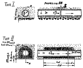 Рис. 13. Конструкции стыков продольных дренажей мелкого заложения: I тип - открытый стык; II тип - стык с прерывистой фильтровой обсыпкой В случае чистых среднезернистых песков при использовании асбестоцементных труб без пропилов на участках с притоком воды q < 3 - 4 л/м2 в сутки допускается устройство стыков II типа. § 45. На участках с таким же притоком воды в корыто, но при устройстве дренирующего слоя из чистых гравелистых или крупнозернистых песков, ракушки и других, хорошо фильтрующих материалов возможно применение и стыков I типа с шириной зазора между звеньями (S) не более чем указано в табл. 4. Допустимые зазоры S между звеньями труб при открытом (I-ом) типе стыков