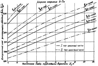 Значит при В = l = 7 м мелкозернистый песок не удовлетворяет по фильтрационным свойствам. В связи с этим попробуем запроектировать двускатное корыто с поперечным уклоном i = 0,02. Тогда значение l уменьшается до 3,5 м. По той же монограмме находим Таким образом, и в этом случае не пригоден мелкозернистый песок для устройства дренирующего слоя. 2. Проверим теперь возможность использования среднезернистого песка при односкатной проезжей части шириной В = 7 м Поскольку коэффициент- его фильтрации К = 8 м/сутки и q = 0,003 м3/сутки на 1 м2, то