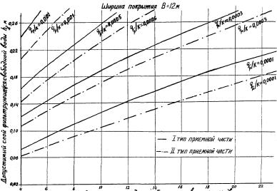 Рис. 16 б. Номограмма для определения расстояния между трубчатыми воронками при ширине покрытия В = 12,0 м: К - коэффициент фильтрации, м/сутки; qp - рассчетное значение удельного притока свободной воды, поступающей в дренирующий слой из расчета на 1 м2 его поверхности, м3/сутки где h - глубина продольного ровика по краям корыта, м; hg - толщина дренирующего слоя (по оси дороги, м), принимаемая по расчету из условия прочности и допустимого морозного пучения дорожной одежды. В случае мелкозернистых песков и усовершенствованных покрытий капитального типа: