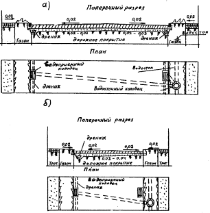 Рис. 17. Конструкции дренирующих слоев городских улиц с продольными дренажами мелкого заложения: а) при ширине проезжей части В > 7,0 м; б) то же, В < 7,0 м На участках дороги с продольным уклоном больше поперечного для сброса воды применяют поперечные дренажи мелкого заложения, называемые сокращенно поперечными прорезями (рис. 18).