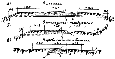 Рис. 20. Поперечные профили земляного полотна с прорезями мелкого заложения: а) сквозная прорезь в насыпях; б) укороченная прорезь в полувыемке-полунасыпи; в) укороченная прорезь в нулевых местах и выемках; 1 - покрытие и основание; 2 - дренирующий слой; 3 - прорезь на ширину проезжей части с продольной трубчатой дреной; 4 - углубленный ровик; 5 - лоток-кювет глубиной 0,3 - 0,5 м с травяным покровом на откосах крутизною 1:3 Сквозные прорези более эффективно осушают дорожные одежды и верхнюю часть земляного полотна, чем укороченные; усиливают процесс воздушного осушения. § 76. Воду из укороченных прорезей сбрасывают в южную сторону от оси дороги, где быстрее оттаивает обочина. § 77. В выемках, нулевых местах и на косогорах воду из прорезей нужно сбрасывать в продольную дрену (рис. 20). § 78. Прорези устраивают в ровиках треугольного сечения глубиной 0,15 м, которые не ухудшают ровности дорожных покрытий в зимний период вследствие неравномерного пучения связных грунтов, особенно пылеватых.