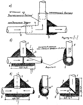 Рис. 22. Возможные конструкции сопряжения продольных трубчатых дрен и поперечных выпусков: а) при помощи бетонных угольников или б) фильтровых обсыпок из каменных материалов; в) с устройством срезов труб 1 - поперечный выпуск; 2 - продольная дрене; 3 - каменная мелочь или мелкий гравий размером 5-8 (10) мм) § 104. При асбестоцементных и пластмассовых трубах пропилы требуемой ширины нарезают при помощи слесарной пилы или специальных нарезчиков. Примечание. Диски наждачного типа, применяемые для нарезки швов цементобетонных покрытий, непригодны, так как ширина пропилов, как правило, превышает 5-6 мм § 105. Если нет других труб, кроме гончарных, то с целью снижения боя и повышения их жесткости рекомендуется применять гончарные грубы со спиральными ребрами жесткости. § 106. Трубы укладывают пропилами или перфорированной частью вниз, что обеспечивает поступление в них воды при минимальных гидравлических градиентах. Кроме того, снижается и степень кольматации дренажей. § 107. Для устройства стыков с прерывистой или сплошной фильтровой обсыпкой (II и III типы) применяют специальный шаблон, изготовленный из котельного железа толщиной 1-2 мм (рис. 23).