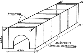 Рис. 23. Шаблон для устройства фильтровой обсыпки Шаблон устанавливают на трубы, предварительно уложенные по уровню, и засыпают рыхлым каменным материалом. Затем шаблон обсыпается песком с одновременным его уплотнением. При этом сохраняется форма фильтровой обсыпки в песке, и шаблон свободно передвигается на следующий стык. § 108. Откосы в местах выхода поперечных сбросов воды из дрен укрепляют бетонными плитами для предотвращения их размыва (см. рис. 9). § 109. Только по окончании устройства выходной части продольных дренажей, трубчатых воронок или прорезей с оформлением акта на скрытые работы разрешается завозить в корыто фильтрующий материал. IV.5. Технологические особенности устройства дренирующего слоя§ 110. При устройстве дренирующего слоя соблюдают следующую последовательность технологических операций: 1. Вывозка фильтрующего материала и его разгрузка на предварительно подготовленную поверхность земляного полотна. 2. Разравнивание фильтрующего материала с соблюдением требуемой толщины слоя и учетом коэффициента уплотнения. 3. Уплотнение фильтрующего материала при оптимальной влажности. 4. Планировка поверхности дренирующего слоя с соблюдением требуемого поперечного профиля. § 111. При устройстве дренирующего слоя в сухое время года, когда не образуются колеи, допускается движение транспорта по подготовленному земляному полотну. Движение транспорта по дренирующему слою категорически запрещается. Только в отдельных случаях (в сырую погоду, при невозможности устройства временных дорог) допускается подвозка фильтрующих материалов по дренирующему слою, укладываемому по способу "от себя". § 112. При распределении и уплотнении фильтрующего материала, а также планировке его поверхности по способу "от себя" целесообразно использование бульдозера, автогрейдера, катков и других дорожных машин. § 113. Укладка фильтрующего материала производится послойно в зависимости от типа уплотняющих средств и требуемого коэффициента уплотнения (Ко). Минимальная допустимая толщина укладываемого слоя должна быть не менее 0,25 м; она гарантирует устойчивость дренажных устройств. § 114. Наиболее эффективное уплотнение песков достигают применением тяжелых пневмокатков или вибрационных машин. При этом, независимо от типа покрытия, Ко должен равняться 1. § 115. Для большей эффективности уплотнения одноразмерных песков их влажность должна превышать оптимальную на 2-3 %. § 116. Устройство дренирующего слоя допускается в зимний период при условии завершения его уплотнения до начала смерзания. § 117. По законченному тщательно спланированному дренирующему слою не допускается движение транспорта. V. КОНТРОЛЬ КАЧЕСТВА РАБОТ ПО УСТРОЙСТВУ ДРЕНИРУЮЩЕГО СЛОЯ§ 118. Качество работ последовательно проверяют после каждого законченного цикла: рытье продольных и поперечных ровиков, устройство дренирующего слоя под трубы и их укладка, устройство фильтровых обсыпок и уплотнение материала дренирующего слоя, а также планировка его поверхности под шаблон. § 119. Контроль геометрических элементов земляного полотна и корыта через каждые 5 м производят геодезическими приборами. Допускаемые отклонения при устройстве корыта: по ширине ±0,05 м, глубине ±5 % и отметке дна ±0,03 м. § 120. Плотность дренирующего слоя определяют взятием не менее трех образцов (по оси и на расстоян