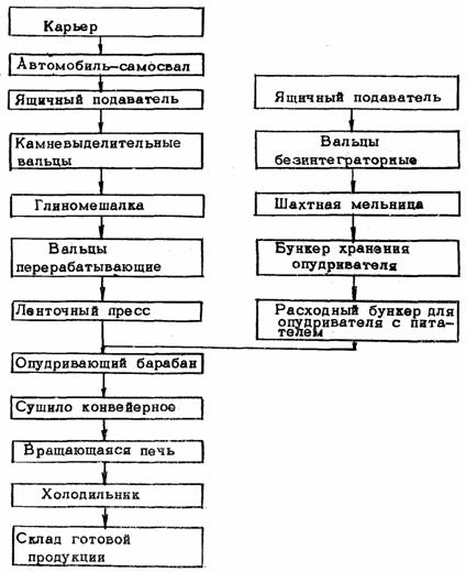 Преобладающая часть глин имеет интервал спекания не более 15-25°С и относится к неспекающемуся сырью. 3.3. Расширить сырьевую базу для производства керамдора за счет не спекающегося сырья возможно путем проведения одного из следующих мероприятий: введения в глиняную массу тугоплавких или огнеупорных материалов; опудривания сырцовых гранул тугоплавкими или огнеупорными материалами; использования более совершенного оборудования. 3.4. Пригодность глинистого сырья для производства керамдора следует определять, исходя из технологии его производства. 3.5. Лабораторные испытания глинистого сырья и керамдора проводят в соответствии с “Методическими рекомендациями по технологии производства керамдора для применения в конструкциях дорожных одежд” и положениями настоящих “Методических рекомендаций”. 4. Особенности технологии производства керамдора из неспекающихся глинОбогащение сырья минеральными добавками.4.1. В зависимости от вида и свойств сырья керамдор можно получить тремя способами: мокрым, сухим и пластическим. Наиболее применим пластический способ, позволяющий использовать неспекающееся сырье при введении в шихту минеральных добавок. Основные положения технологии получения керамдора пластическим способом изложены в “Методических рекомендациях по технологии производства керамдора для применения в конструкциях дорожных одежд”. 4.2. Технологический процесс получения керамдора пластическим способом из не спекающихся глин состоит аз следующих операций: добыча глинистой породы, пластическая переработка сырья и изготовление гранулированного сырца, введение в шихту минеральных добавок (рис.2), сушка сырца, обжиг полуфабриката, охлаждение керамдора, рассев и складирование готового продукта. 4.3. В качестве минеральных добавок рекомендуется использовать тугоплавкие материалы: диатомиты, огнеупорные и тугоплавкие глины, формовочные и речные мелкозернистые пески. 4.4. Обогащение не спекающихся глин с температурным интервалом спекания 15-35°С позволяет расширить последний до 40-70°С. Эффективность обогащения зависит от индивидуальных свойств глин и добавок и определяется в лабораторных условиях, а затем в процессе полузаводских испытаний или непосредственно в производственных условиях. 4.5. Показатель огнеупорности минеральных добавок должен быть выше, чем у не спекающегося глинистого сырья. Чем больше разница в этих показателях, тем значительнее расширяется температурный интервал спекания неспекающейся легкоплавкой глины. 4.6. Оптимальное содержание добавок определяют в процессе лабораторных исследований. Оно составляет, как правило, 5-25 % массы сырцовых гранул. 4.7. Технологический процесс производства керамдора с обогащением сырья минеральными добавками должен обязательно включать интенсивное механическое растирание и перемешивание глиняной массы в целях достижения ее максимальной однородности. Наиболее эффективно применять при этом бегуны мокрого помола, в которых одни и те же кусочки глины подвергаются многократному раздавливающему и истирающему воздействию тяжелых катков, что и обеспечивает тонкое, измельчение глины. Глину и добавки на бегунах Рис. 2. Схема производства керамдора с применением метода обогащения сырья необходимо обрабатывать при влажности шихты, близкой к нормальной формовочной. 