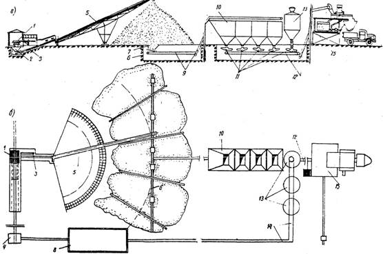 Рис. 1. Схема приготовления смеси на прирельсовом предприятии: а - профиль; б - план; 1 - разгрузчик каменных материалов; 2 - питатель; 3 - транспортер; 4 - разгрузчик порошкообразных материалов; 5 - веерный транспортер; 6 - подштабельная галерой с течками; 7 - питатели материалов; 8 - склад порошкообразных вяжуших; 9 - транспортеры; 10 - расходные бункера каменных материалов; 11 - дозаторы; 12 - транспортер; 13 - расходный склад порошкообразных вяжущих; 14 - аэрожелоб. железнодорожным транспортом. Возможна доставка отдельных компонентов автомобильным транспортом. Для разгрузки зернистых материалов из железнодорожных вагонов используют разгрузчики. Сгружаемый материал попадает в подрельсовый бункер, откуда питателем подается на веерный транспортер-штабелеукладчик. Штабелеукладчик складирует материалы по фракциям. Из штабелей материалы питателем подаются на транспортер, находящийся в подштабельной галерее, а оттуда - в расходные бункера дозаторного отделения. 25. Порошкообразные вяжущие разгружаются пневморазгрузчиками, после чего подаются на склад и со склада с помощью эрлифтов и аэрожелобов в расходную емкость дозаторного отделения. Для транспортирования вяжущих допускается применять шнековые конвейеры и ковшовые элеваторы. 26. Вода от источника подается насосом по системе трубопроводов в накопительную емкость, откуда при необходимости в узел введения различных добавок. Вода или полученный раствор подаются также насосом в дозаторное отделение. 27. В дозаторном отделении происходит дозирование всех компонентов смеси (в соответствии с заданным расходом каждого материала путем настройки дозаторов на требуемую величину расхода), которые транспортером подаются в смеситель, где интенсивно перемешиваются. Затем смесь загружается в накопительный бункер, откуда поступает в самосвалы и транспортируется к месту укладки. Технология приготовления смеси на притрассовом предприятии 28. Технология приготовления смеси на притрассовом предприятии приведена на рис. 2, а основные данные по машинам и оборудованию, последовательность производства работ и затраты - в табл. 2 (приложение 1).