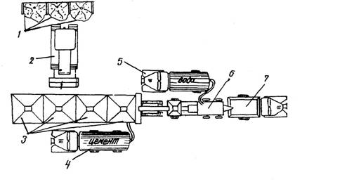 Рис. 2. Схема приготовления смеси на притрассовом предприятии: 1 - склад материалов; 2 - автопогрузчик; 3 - расходные бункера с дозаторами; 4 - автоцементовоз; 5 - поливомоечная машина ПМ-10; 6 - смеситель ДС-78; 7 - автомобили-самосвалы 29. Зернистые материалы (гравий, песок, щебень, гранулированный шлак и др.) доставляют с места разработки в карьере или с прирельсовой базы на склад самосвалами. Склад должен устраиваться из нескольких секций. Со склада материалы подаются ковшовыми автопогрузчиками в бункера с дозирующими устройствами непрерывного действия, под которыми расположен ленточный транспортер, направляющий материал в смесительную установку. 30. Порошкообразные вяжущие доставляются автоцементовозами и подаются в специальный расходный бункер дозаторного отделения. При необходимости притрассовое предприятие оснащается накопительным складом для вяжущих. Подача вяжущих со склада в расходный бункер осуществляется аэрационным способом. 31. Вода, как правило, подается в расходную емкость насосом из близко расположенных водоемов по системе трубопроводов, после чего дозируется. При отсутствии естественных источников вода доставляется к смесительному узлу специализированными автоцистернами. В случае необходимости система подачи воды оснащается узлом введения добавок. 32. Дозирование компонентов смеси происходит в соответствии с заданным расходом каждого материала путем настройки каждого дозатора на требуемую величину расхода. Отдозированные компоненты подаются в смеситель, где интенсивно перемешиваются. Готовая смесь по мере поступления в накопительный бункер выгружается в самосвалы и транспортируется к месту укладки. 3. Способы устройства оснований из укрепленных каменных материалов33. В сооружаемых дорожных одеждах и, в частности, в основаниях из каменных материалов, укрепленных неорганическими вяжущими, при приемке работ допускаются следующие отклонения от проектных размеров (СНиП III-Д.5-62): толщина слоя - 10 %; поперечный уклон - 0,005; наибольший просвет под 3-метровой рейкой - 10 мм. 34. Ровность слоев дорожных одежд обеспечивается применением стабилизирующих (по грейдерной схеме) следящих, программных систем обеспечения ровности. В основе стабилизирующих систем лежит принцип обеспечения зазора не более допустимого под рейкой определенной длины. Эффективным средством уменьшения амплитуды неровностей спланированной поверхности и расширения диапазона выравниваемых длин волн может служить длиннобазовый планировщик ДС-515, выполненный по грейдерной схеме с уменьшенным отношением величины расстояния от оси задней опоры до рабочего органа к базе планировщика. Следящие системы, устанавливаемые на укладчиках и автогрейдерах, обеспечивают получение заданной ровности благодаря перемещению рабочего органа в соответствии с изменением вертикальных отметок реального эталонного продольного профиля, называемого копиром. В качестве копира могут быть использованы: уплотненное и спрофилированное основание или смежная полоса покрытия; жесткий металлический копир из реек длиной 1,5-4,0 м; натягиваемая вдоль покрытия проволока или трос на опорах, устанавливаемых через 5-15 м; луч (световой, лазерный и т.д.) с расстановкой источников излучения через 10-100м в зависимости от продольного профиля дороги. Программные системы задают поверх