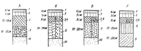 Рис. 1. Типы конструкций дорожных одежд с асфальтобетонным покрытием для дорог с тяжелым движением: 1 - плотный асфальтобетон из мелко- или среднезернистой смеси; 2 - пористый или плотный асфальтобетон из крупнозернистой смеси; 3 - битумоминеральная смесь; 4 - черный щебень; 5 - щебень, укатанный с поливкой водой; 6 - шлакоминеральная смесь (щебень, дробленый гравий или гравий, укрепленный гранулированным доменным шлаком); 7 - цементоминеральная смесь (щебень, дробленый гравий или гравий, укрепленный малым количеством цемента); 8 - зольноминеральная смесь (щебень, дробленый гравий или гравий, укрепленный золами уноса с добавкой цемента); 9 - грунт, укрепленный золами уноса с добавкой цемента; 10 - дренирующий материал в подстилающем слое менее 6000 авт./сутки. В III и IV дорожно-климатических зонах при интенсивности движения автомобилей менее 6000 авт./сутки покрытие может быть однослойным. Расчет толщины слоев оснований и покрытий14. Рекомендуемые дорожные одежды рассчитывают в соответствии с "Инструкцией по назначению конструкций дорожных одежд нежесткого типа", разработанной в 1970г. совместно Союздорнии и МАДИ. Метод расчета, приведенный в этой инструкции, применим к одеждам с капитальными нежесткими покрытиями на дорогах высших категорий, к конструктивным слоям которых предъявляются высокие требования в отношении прочности, долговечности и обеспечения возможности движения с высокими скоростями. В качестве расчетной модели в новом методе принято слоистое упруго-изотропное полупространство. 15. В основу расчета по новому методу положены следующие наиболее важные, в данном случае, условия прочности: а) в расчетный период, не должно достигаться предельного равновесия по сдвигу в подстилающем грунте и в слабосвязных материалах конструктивных слоев одежды; б) напряжения в монолитных слоях одежды не должны превосходить допустимых из условия сохранения структуры материала; в) растягивающие напряжения и прогибы не должны превышать допустимых из условия сохранения сплошного слоя с учетом повторности нагрузок. Поэтому не следует укладывать в покрытие и в верхний слой основания те материалы, которые обладают излишней жесткостью при низких температурах; г) толщина отдельных слоев должна быть достаточной для того, чтобы обеспечивалось надлежащее формирование слоя и надежная его работа при эксплуатации. 16. В расчетах учитывают как деформативные (модули упругости), так и прочностные (сопротивление сдвигу, растяжению) характеристики материалов и грунтов. Примечание. Новый метод расчета дает возможность обосновать расчетом не только общую толщину одежды, но и необходимую толщину каждого конструктивного слоя. 17. Для расчета толщины дорожной одежды, в том числе и оснований из укрепленных материалов, рекомендуются следующие модули упругости конструктивных слоев из материалов, укрепленных вяжущими (табл. 1). Модули упругости конструктивных слоев, из материалов укрепленных вяжущими