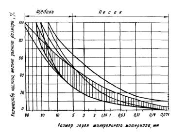 Рис. 2. Графики гранулометрических составов битумоминеральных, шлакоминеральных, зольноминеральных и цементоминеральных смесей Примечание. Принципы построения кривых - кубическая парабола. Гранулометрический состав минеральной части в них битумоминеральных смесей и содержание битума в % по весу
