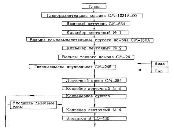 Рис. 1. Технологическая схема производства керамдора пластическим способом В качестве дозатора используют ящичные подаватели типов СМ-25, СМ-26, СМ-229, СМ-664, лотковые питатели типов К-1 и К-2 или ленточные питатели типов ПТ-4, ПТ-5 или ПТ-8. Для удаления крупных включений и дальнейшего измельчения комьев глина поступает на камневыделительные вальцы, куда подается и дозируемая с необходимой точностью добавка. Применяют вальцы дезинтеграторные типов СМ-22, СМ-150, СМ-150А, CM-231 или винтовые СМ-416. Дальнейшее измельчение глины происходит в процессе ее переработки вальцами тонкого помола типов Крок № 2, 3, 4, СМ-23, СМ-24 или дырчатыми перерабатывающими вальцами СМ-369А. При использовании высокопластичных неоднородных глин, а также при применении добавок для получения более однородной массы следует использовать вальцы тонкого помола и дырчатые формирующие вальцы или бегуны мокрого помола СМ-268. Далее глина поступает в глиномешалку, где интенсивно перемешивается, а при необходимости и увлажняется. Рекомендуется применять двухвальные глиномешалки типов СМ-27, СМ-27А, СМ-447, СМ-246. 33. Увлажненная до нормальной формовочной (оптимальной) влажности и тщательно перемешанная однородная глинистая масса из глиномешалки поступает в ленточный пресс для получения гранулированного сырца, на котором устанавливается лобовая решетка с квадратными отверстиями со стороной от 5 до 25 мм. Целесообразно иметь 2 - 3-сменные решетки с отверстиями 10×10; 15×15; 20×20 мм и т.д. Формирование сырца узкого гранулометрического состава облегчает его транспортировку (отсутствие слипания гранул), сушку до определенной остаточной влажности обусловливает получение более качественного и однородного материала при обжиге. Рекомендуется использовать безвакуумные ленточные прессы типов СМ-58, СМ-294, СМ-28 или вакуумные типов СМ-277, СМ-443, СМ-142, СМ-446, СМ-32. 34. Сырые гранулы поступают в сушильный барабан, где сушатся за счет тепла отходящих газов вращающейся печи. Можно применять сушильные барабаны типов СМ-45А, СМ-147, СМ-455, СОБУ-5, 168-00. При получении керамдорового щебня целесообразно применять ленточные конвейерные сушила, обеспечивающие сохранение исходного гранулометрического состава и остроугольности сырца. Начальная температура сушки не должна превышать 100 - 150°C режим сушки должен обеспечивать получение полуфабриката с остаточной влажностью, установленной по результатам лабораторных и заводских испытаний. После сушки полуфабрикат элеватором (типов ЭГЦО-450, Т-52 или др.) подается в бункер сухих гранул, рассчитанный не менее чем на 18-часовой запас работы печи. Из бункера питателем (маятниковым С-633, тарельчатым или др.) полуфабрикат подается во вращающуюся печь для обжига. 35. Обжиг полуфабриката во вращающейся печи является основной операцией технологического процесса, в значительной степени определяющей структуру, свойства и характер поверхности частиц керамдора. Режим обжига должен обеспечивать условия, необходимые для получения материала плотной структуры с необходимыми показателями физико-механических свойств; должны быть выдержаны температурные интервалы, время обжига и другие параметры, рекомендованные на основании лабораторных испытаний. 36. Для обжига гранул можно использовать вращающиеся печи различной длины; типовые печи имеют следующие размеры (длину и диаметр): 12×1,2; 22×2,3; 40×2,
