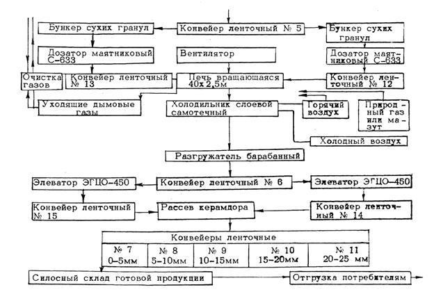 Рис. 2. Технологическая схема завода по производству керамдора (вариант) - глины с большим содержанием глинистых частиц ("жирные", тяжелые глины) и с коротким интервалом обжига (20 - 50°); - при наличии двух вращающихся печей небольшой длины (22 м и меньше). При наличии двух печей можно осуществлять непрерывный обжиг, используя одну печь для прокаливания, а другую - для обжига. Гранулы из высококачественного сырья можно обжигать за один цикл далее в печах небольшой длины (22 м и меньше). В этом случае влажность поступающих в печь гранул должна быть не более 1 - 2 %. Начальная температура обжига в зависимости от состава сырья и влажности полуфабриката обычно находится в пределах 250 - 700°, температура прокаливания 600 - 850°. Конечная температура обжига (в зоне спекания) обычно составляет 1050 - 1250°. 38. Следует обжигать полуфабрикат узкого гранулометрического состава (5 - 10, 10 - 15, 15 - 20 мм). Совместный обжиг нескольких фракций (5 - 15, 10 - 20 мм) увеличивает вероятность слипания гранул в зоне спекания, не обеспечивает однородности качества материалов. 39. Топливосжигающая аппаратура должна обеспечивать вытянутую зону спекания без резких перепадов температуры по длине печи, исключать возможность перегрева материалов (оплавление, сваривание), создавать в печи среду с содержанием кислорода 2 - 6 %. Эксплуатация вращающихся печей, включая розжиг и разогрев печи, процесс обжига полуфабриката и мероприятия по борьбе с образованием при обжиге "спеков", "колец" и т.п. осуществляется в соответствии с правилами работы и обслуживания, а также в соответствии с "Инструкцией по обжигу керамзитового гравия" (ВНИИнеруд, Куйбышев, 1967). 40. После обжига керамдор, имеющий температуру 750 - 1000°, поступает в холодильное устройство - барабанный или шахтный холодильник. Примечание. Рекомендуется применять самотечно-слоевой холодильник конструкции Ниикерамзита. Правильный режим охлаждения до 50 - 70° для получения высококачественного материала должен обеспечивать: - медленное охлаждение гранул от момента выгрузки из печи до температуры 550 - 600° (со скоростью не более 20 град/мин); - быстрое охлаждение от температуры 550 -600°. 41. После охлаждения керамдор подается на грохот для рассева на фракции в зависимости от величины сырца (меньше 5 мм – 5 - 10 мин и т.д.) и направляется на склад готовой продукции, в силосы или бункера. Примечание. При стабильности технологического процесса и постоянстве состава сырья по договоренности с потребителем материал может отпускаться в виде смеси фракций. Фракция менее 5 - 10 мм может быть получена путем дробления крупных частиц керамдора. 42. Агрегаты технологической линии должны быть снабжены необходимыми приборами контроля в соответствии с требованиями технических документов промышленности строительной керамики и современными проектами керамзитовых заводов. Контроль производства керамдора43. В процессе производства керамдора должен осуществляться систематический контроль за всеми технологическими параметрами и качеством получаемого материала. Схемы лабораторного и производственного контроля приведены в табл. 1 и 2. Таблица 1 Схема лабораторного контроля технологического процесса производства