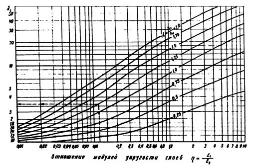 Рис. 4. Номограмма для определения безразмерного изгибающего момента в монолитном слое 4.5 Проверяют прочность конструкции по условию недопустимости сдвига в подстилающем плиту полупространстве: