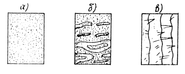 Рис. 1.1. Основные виды текстур мерзлых грунтов: а - массивная; б - слоистая; в - сетчатая Вечномерзлые грунты классифицируются I - по физическому состоянию (или температуре); II - по территориальному распространению; III - по продолжительности существования. I. По физическому состоянию: - низкотемпературные (твердомерзлые), то есть прочно спаянные льдом, практически несжимаемые грунты с температурой ниже границ замерзания грунтов (для песков пылеватых температура замерзания ниже -0,3°С, для супесей ниже -0,6°С, для суглинков ниже -1°С и для глин -1,5°C); - высокотемпературные (пластичномерзлые), то есть с большим содержанием незамерзшей воды, с температурой ниже 0°С и выше температуры замерзания грунтов, обладающие вязкими свойствами и характеризуемые способностью сжиматься под нагрузками oт вооружения. II. По территориальному распространению вечномерзлых грунтов: - районы географически сплошной вечной мерзлоты, то есть обширные пространства, в пределах которых вечная мерзлота, как правило, наблюдается повсеместно; - районы, в пределах которых обширные пространства с вечномерзлыми грунтами на более или менее значительном протяжении расчленены таликами. Талики представляют собой талые породы, ограниченные в своем распространении мерзлыми породами; - острова и районы островов с вечномерзлыми грунтами вдали от общего вечномерзлого массива. III. По продолжительности существования: - кратковременномерзлые грунты (в течение нескольких суток); - сезонномерзлые грунты (в течение нескольких месяцев, менее года); - многолетнемерзлые или вечномерзлые грунты (в течение более 3-х лет до сотен, десятков сотен и даже нескольких тысяч лет), то есть существующие "вечно". Кроме того, могут быть случаи, когда верхний слой грунта при замерзании не сливается с вечномерзлыми (несливающаяся мерзлота) и сливается (сплошная сливающаяся мерзлота) (рис. 1.2.).