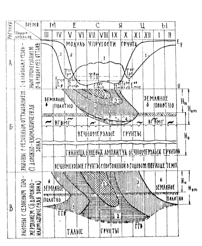 Степень просадочности определяется по формуле где γМ - объемный вес скелета в мерзлом состоянии, г/см3; γТН> - объемный вес скелета грунта, оттаявшего под нагрузкой 9,80665.104 н/м3. Здесь вечномерзлые грунты встречаются или в виде сплошной высокотемпературной вечной мерзлоты, или в виде отдельных мерзлых островов среди талой толщи грунта. В горных районах в связи с вертикальной зональностью необходимо учитывать изменение природно-климатических условий, по мере увеличения высоты пояса. В гористой местности вечномерзлые грунты обычно встречаются на заболоченных участках, склонах северной экспозиции и в пониженных затененных местах. Земляное полотно на участках островной мерзлоты следует проектировать и строить по третьему принципу, то есть с обеспечением предварительного оттаивания грунтов основания и осушения дорожной полосы до возведения земляного полотна. Для более детальной характеристики условий район проложения трассы автомобильной дороги принято делить на участки (типы местности) по характеру поверхностного стока и степени увлажнения (СНиП II-Д.5-72). Такое деление на типы местности возможно также и для зоны вечной мерзлоты с введением дополнений, отражающих специфические мерзлотно-грунтовые условия этой зоны (табл. 3.2), которые, в свою очередь, определяют выбор и расчет дорожных конструкций. 4. ОСОБЕННОСТИ ВОДНО-ТЕПЛОВОГО РЕЖИМА ЗЕМЛЯНОГО ПОЛОТНА И РАСЧЕТА НА ПРОЧНОСТЬ ДОРОЖНЫХ КОНСТРУКЦИЙ НЕЖЕСТКОГО ТИПАСвоеобразные гидрогеологические условия в сочетании с суровыми природно-климатическими факторами зоны вечной мерзлоты предопределяют особый водно-тепловой режим земляного полотна автомобильных дорог. Оттаивание земляного полотна и основания в зоне вечной мерзлоты протекает по схеме (рис. 4.1.B), подобной схеме промерзания, например, во II дорожно-климатической зоне СССР (рис. 4.1,B), так как имеет место одинаковое направление потоков тепла (в зоне вечной мерзлоты) и потоков холода (в районах сезонного промерзания). В рассматриваемой зоне оттаивание происходит сверху и продолжается в течение всего теплого периода года, пока не установится динамическое равновесие между потоками тепла сверху от атмосферы и потоками холода снизу от вечномерзлых грунтов. Процесс промерзания земляного полотна и основания в зоне вечной мерзлоты (см. рис. 4.1.,Б) подобен схеме процесса оттаивания в средней полосе страны (см. рис. 4.1,Б). В обоих случаях имеет место двустороннее направление потоков: холода - в зоне вечной мерзлоты и тепла - в средней полосе страны. Промерзание в зоне вечной мерзлоты происходит с двух сторон: сверху - за счет отрицательных температур воздуха и снизу - за счет охлаждения от вечномерзлых грунтов. Таким образом, в зоне вечной мерзлоты в течение всего теплого времени года в земляном полотне или в его основании находится мерзлый (вечномерзлый), практически несжимаемый слой грунта на незначительной глубине оттаивания (до 1,5 м). Как установлено (Н.А. Цытович и др.), модули упругости (деформации) мерзлых глинистых грунтов имеют высокие значения, а талых - в несколько раз (иногда в десятки раз) меньше. В переходном состоянии от мерзлого к талому величина модуля упругости может иметь различные промежуточные значения, которые уменьшаются как за счет перехода мерзлого состоянии грунта в талое, так и более глубокого расположени