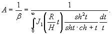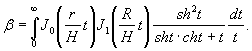 где R - радиус штампа, см; r - расстояние от центра круглого штампа до точки, перемещения которой определяют, см; J0 - функция Бесселя нулевого порядка первого рода; J1 - функция Бесселя нулевого порядка второго рода; sh, ch - соответственно гиперболические синус и косинус; t - произвольный параметр интегрирования; H - мощность талого слоя грунта, см. Для точек, расположенных под центром нагруженной площадки, то есть при r = 0, J0 - 1,0, коэффициент влияния жесткого несжимаемого слоя на величину модуля упругости является обратной величиной коэффициента β: