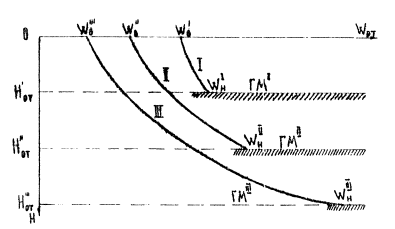Таким образом, влияние мерзлого слоя на прочность оттаивающего грунта может быть определено по формуле (4.2.) или по графику (риc. 4.2.). В грунтах земляного полотна и основания, как правило, влажность по глубине неоднородна (в верхних слоях меньше, а в нижних больше) и в течение всего периода оттаивания имеет непостоянные значения (рис. 4.3.). Указанную закономерность для естественных условий зоны вечной мерзлоты отмечали проф. Н.А. Пузаков и мерзлотоведы, однако практических рекомендаций по ее учету при оценке прочности грунтов не было сделано. Характерные эпюры распределения влажности по глубине оттаявшего слоя в расчетный период (весна-лето) были установлены автором в процессе обследования автомобильных дорог в зоне вечной мерзлоты. В начале оттаивания земляного полотна происходит увлажнение верхнего активного слоя грунта (весенний период), затем, по мере опускания границы оттаивания вниз, вслед за горизонтом мерзлоты опускается свободная влага под действием гравитационных сил. В летний период за счет испарения с поверхности и инфильтрации просыхают верхние слои земляного полотна, а в нижних слоях на границе с мерзлым грунтом наблюдается максимальная влажность, нередко достигающая предела текучести. Такое распределение влажности обусловливает неравнопрочность грунтов по глубине, что следует учитывать в расчетах прочности дорожных конструкций. По фактическим данным натурных исследований автором было установлено (1966 г.), что при глубине оттаивания более величины НОТ, равной 3 диаметрам штампа, влажность грунта по глубине распределяется по экспоненциальной зависимости. Следовательно, зная влажность верхнего и нижнего слоев, можно по зависимости Е = f/(W) определить соответствующие значения модулей упругости или деформации любого слоя грунта.