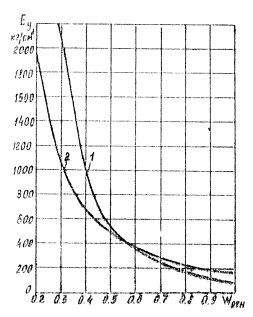 Рис. 4.8. Зависимость модуля упругости грунта от его влажности: 1 - суглинки и глины; 2 - супеси Формулы (4.6.) и (4.10) справедливы в пределах значений