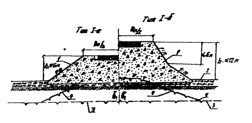 Тогда ширина земляного полотна В = 2.В2 + 2.Об = 2.4,6 + 2.2,5 = 14,2 м. Принимаем В = 14 м. При обочинах шириной 3 м соответственно В = 15 м. 5.2.1. Конструкции земляного полотна по первому принципу проектирования Проектирование по первому принципу ведут на особо сложных по мерзлотно-грунтовым условиям участках (3-й тип местности) с низкотемпературной вечной мерзлотой на глинистых сильнопросадочных грунтах с влажностью выше предела текучести, когда оттаивание грунта основания не допускается, так как может привести к недопустимым деформациям и разрушению дорожной одежды. При проектировании автомобильных дорог по принципу обеспечения мерзлого состояния грунтов основания земляное полотно конструируют в насыпях (безрезервный поперечный профиль) из несцементированных обломочных грунтов с обязательным сохранением в неразрушенном состоянии мохорастительного покрова в основании насыпи и на всей дорожной полосе (рис. 5.1, тип I). В лесистой местности ширина просеки не должна превышать ширины основания насыпи. Для предохранения мохорастительного покрова от разрушения целесообразно предусматривать в нижней части насыпи прослойки из дренирующих грунтов мелких фракций (не крупнее 50 - 100 мм) толщиной 0,3 – 0,8 м (рис. 5.2., тип II). При необходимости уменьшения высоты насыпи или наличии дешевых местных теплоизоляционных материалов в основание земляного полотна укладывают теплоизоляционные прослойки различной толщины (рис. 5.2, тип III) из местных строительных материалов, обладающих небольшим коэффициентом теплопроводности и достаточной прочностью (уплотненные мох и торф, нестроевая древесина, шлак и другие местные или привозные теплоизоляционные материалы). Если высокие насыпи сооружают в две стадии, то на первой (зимней) стадии применяются только несцементированные обломочные грунты (рис. 5.3., типы IV и V), а на второй стадии (летней) допускаются глинистые грунты.