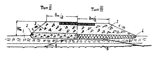 Рис. 5.3. Поперечные профили насыпей на льдонасыщенном основании, отсыпаемых в две стадии: 1 - щебень или гравий по расчету на прочность (но не менее 0,5 м); 2 - глинистый грунт; 3 – несцементированный обломочный грунт; 4 – мохорастительный покров; 5 - ВГВМ до постройки насыпи; 6 - ВГВМ после постройки насыпи