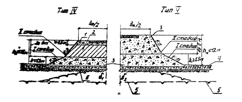 Рис. 5.1. Поперечный профиль насыпи на льдонасыщенном основании: 1 - несцементированный обломочный грунт; 2 - мохорастительный покров; 3 - верхняя граница вечной мерзлоты (ВГВМ) до постройки насыпи; 4 - ВГВМ после постройки насыпи Рис. 5.2. Поперечные профили насыпи на льдонасыщенных грунтах: 1 - мохорастительный покров; 2 - защитный слой из дренирующего грунта мелких фракций; 3 – несцементированный обломочный грунт; 4 - термоизоляция из мха (назначается на основе теплотехнического расчета); 5 - ВГВМ до постройке насыпи; 6 - ВГВМ после постройки насыпи В таких случаях верхняя часть насыпи отсыпается из щебеночного или гравийного материалов слоем не менее 0,5 м (см. рис. 5.3., тип IV). На косогорных участках (не круче 1:5) земляное полотно проектируют в насыпи, иногда (на участках не положе 1:10) предусматривают полунасыпи-полувыемки. Во избежание нарушения мерзлотного режима местности, увеличения глубины оттаивания и снижения устойчивости сооружения уступы на косогоре не устраивают. В низовой части откоса насыпи защищают от теплового воздействия основания присыпкой из мохоторфа или другого теплоизоляционного материала (например, пенопласта, полистирола и др.) (рис. 5.4., тип VI). 5.2.2. Конструкции земляного полотна по второму принципу проектирования Проектирование по второму принципу ведут на сложных по мерзлотно-грунтовым условиям участках (2-й тип местности) с низкотемпературной вечной мерзлотой на глинистых и песчаных просадочных грунтах с влажностью менее предела текучести, когда прогнозируют оттаивание грунтов естественного основания с учетом допускаемых деформаций покрытия в процессе эксплуатации дороги. При проектирований автомобильных дорог по принципу ограничения глубины оттаивания грунтов основания, исходя из допустимых деформаций, земляное полотно конструируют в соответствия с поперечными профилями, приведенными на рис. 5.1. - 5.4. Допускается возводить земляное полотно из местных глинистых грунтов с закладкой сосредоточенных или притрассовых резервов (рис. 5.5., типы VII, VIII). При этом запрещается убирать или разрушать мохорастительный покров в основании насыпи.
