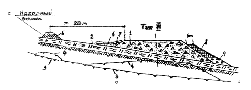 Рис. 5.6. Поперечный профиль насыпи на косогоре (круче 1:5): 1 - подпорная станка; - несцементированный обломочный грунт; 3 - мохорастительный покров; 4 - мерзлотный валик; 5 - укрепление бетонными плитами на слое из мохоторфа; 6 - нагорная водоотводная канава; 7 - ВГВМ до постройки насыпи; 8 - ВГВМ после постройки насыпи