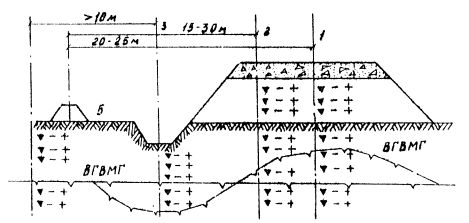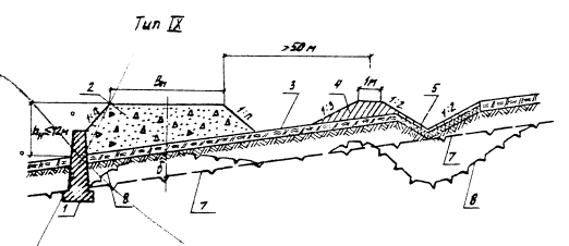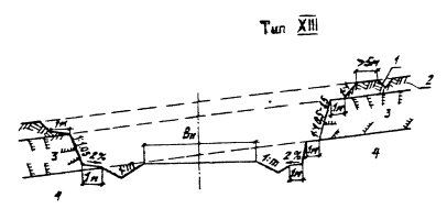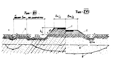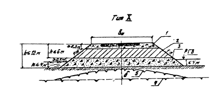 Рис. 5.8. Поперечный профиль насыпи на затапливаемой пойме (насыпь высотой до 12 м, глубина воды на пойме до 4 м); обозначения те же, что и на рис. 5.7. В случае разработки выемок в сложных грунтово-гидрогеологических условиях (сырые места) их нужно проектировать с соответствующим обеспечением теплоизоляции откосов, заменой переувлажненных пылеватых грунтов песчаным или другим качественным материалом, с устройством в основании дорожной одежды морозозащитных слоев (рис. 5.10., тип XV). Мелкие выемки раcкрывают или разделывают под насыпь для повышения их устойчивости и улучшения их снегонезаносимости (см. рис. 5,10., тип XV). Во всех случаях должен обеспечиваться надежный водоотвод из выемки. Толщину заменяемого в выемках грунта следует определять на основе теплотехнического расчета из условия обеспечения требуемой устойчивости дорожной конструкции. В отдельных случаях при неблагоприятных грунтово-мерзлотных условиях следует устраивать закюветные полки шириной 1,5 - 2 м или уположение откосов выемки. Крутизну откосов выемок, устраиваемых в неблагоприятных гидрогеологических и мерзлотно-грунтовых условиях, следует назначать по индивидуальным проектам.