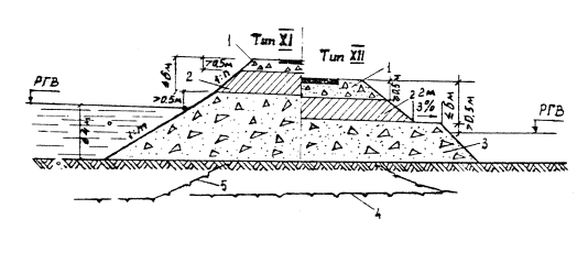 Рис. 5.7. Поперечный профиль на затопляемом участке (насыпь высотой до 12 м, глубина воды на пойме до 4 м): 1 - щебень или гравий по расчету на прочность; 2 - глинистый грунт; 3 - несцементированный обломочный грунт; РГВ - расчетный горизонт воды (конструкция применима при глубине воды до 2 м); 4 - ВГВМ до постройки насыпи; 5 - ВГВМ после постройки насыпи