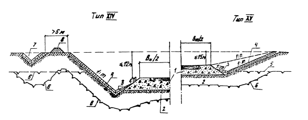 Рис. 5.5. Поперечные профили насыпи из местных глинистых грунтов: 1 - щебень или гравий по расчету на прочность (но не менее 0,5 м); 2 – глинистый грунт из притрассовых резервов; 3 - земляная берма; 4 - мохорастительный покров;. 5 - резерв; 6 - водоотводная канава; 7 - ВГВМ до постройки насыпи; 8 - ВГВМ после постройки насыпи В случае маловлажных грунтов естественного основания и при небольшой высоте насыпи (до 1,5 м) резервы можно располагать непосредственно у подошвы насыпи (см. рис. 5.5., тип VII). На сырых участках местности (II тип) целесообразно предусматривать между подошвой насыпи и внутренней бровкой резерва земляные бермы шириной 3 - 5 м. Поверхность бермы должна иметь уклон в сторону резерва (см. рис. 5.5., тип VIII). На косогорных участках (круче 1:5) земляное полотно низовой части нужно поддерживать специальными подпорными стенками, предусматривая их заглубление в вечномерзлый грунт по расчету на выпучивание (рис. 5.6., тип IX). На затапливаемых участках и на подходах к мостам и другим искусственным вооружениям земляное полотно возводят из несцементированных обломочных грунтов. Бровка земляного полотна должна быть выше уровня расчетного горизонта воды на высоту волны с набегом на откос, но не менее 0,5 м. В случае низкого расчетного горизонта воды верхнюю часть насыпи можно отсыпать из глинистых грунтов. При этом высоту нижней части насыпи из несцементированных обломочных грунтов назначают по расчету (высота подпора вода плюс высота набега волны на широких поймах), во всех случаях она должна быть выше расчетного горизонта воды не менее чем на 0,5 м (рис 5.7., тип X). Высокие насыпи на затопляемых участках конструируют в соответствии с рис. 5.8. (типы XI - XII). 5.2.3. Конструкции земляного полотна в выемках Как отмечалось выше, выемку в зоне вечной мерзлоты допускается проектировать главным образом на участках местности с благоприятными грунтово-гидрогеологическими условиями (скальные, щебенистые и гравелистые грунты) при отсутствии линз и прослоек льда (рис. 5.9., тип XIII).