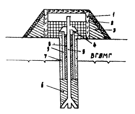 Рис 6.2. Конструкция мерзлотного репера: 1 - деревянный короб; 2 - торф или мох; 3 - грунт; 4 - заглушка; 5 - стержень репера в вечномерзлом грунте; 6 - глинистый раствор; 7 - засыпка песком; 8 - заполнение солидолом; 9 - труба 6.3. Определение модуля упругости мерзлых и оттаивающих грунтов в полевых условиях Модуль упругости мерзлых и оттаивающих грунтов земляного полотна и соответственного основания в зоне вечной мерзлоты определяют посредством пробных нагружений грунта с помощью передвижного пресса. Испытания проводят с помощью специального пресса или более простого оборудования, состоящего из гидравлического (или механического) домкрата, манометра, набора штампов разных диаметров и индикаторов для замера осадок штампа. Домкрат упирают в раму груженого автомобиля или прицепа. Применяемая для испытания установка должна иметь мощность, достаточную для нагружения грунта нагрузками, превышающими расчетные. Осадки штампа замеряют гремя индикаторами, установленными на равном расстоянии от центра штампа и друг от друга (под углом 120о). На основании этих данных вычисляют упругую деформацию при каждой ступени нагрузки штампа и строят зависимость величины деформации от удельного давления. Имея значения упругой деформации при каждой степени удельной нагрузки Р, по формуле вычисляют величину модуля упругости