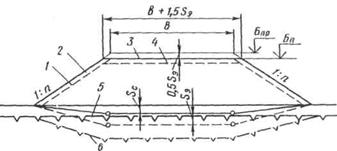 Рис. 1. Расчетная схема к определению осадок и увеличению начальных размеров насыпей: 1 - откос насыпи типовой конструкции; 2 и 3 - запас по ширине и высоте насыпи; 4 - верхний слой насыпи, досыпаемый в условиях эксплуатации; 5 и 6 - поверхность вечномерзлого грунта соответственно в естественных условиях и после ее понижения на расчетную глубину; Бпр и Бп - отметка бровки земляного полотна соответственно проектной и профильной высоты При этом величина запаса по высоте должна быть не более 0,5sэ, а временное изменение продольного профиля, необходимое для сопряжения участков земляного полотна с повышенной бровкой и подходами к мостам и скальным выемкам должно быть выполнено с учетом обеспечения возможности нормального движения поездов.