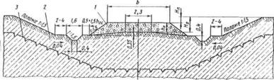 Рис. 6. Поперечный профиль выемки в глинистых грунтах, переходящих при оттаивании в текучепластичное и текучее состояние: 1 - лоток противопучинной конструкции; 2 - галька или гравий, а если выемка прорезает плывуны или глинистые грунты, то крупнозернистый песок 3 - укрепление откосов; hв - глубина вырезки, назначаемая но расчету; Нп - глубина выемки по продольному профилю 3.37. Поперечные профили выемок в глинистых грунтах, приобретающих при оттаивании тугопластичную и мягкопластичную консистенцию (0,25< IL<0,75), следует проектировать применительно к рис. 3, текучепластичную и текучую (IL > 0,75) - применительно к рис. 4, 5 и 6. В выемках, проектируемых применительно к рис. 4 и 5, следует предусматривать продольный уклон дна не менее 0,005. Если по условиям рельефа местности такой уклон невозможно обеспечить, выемку следует проектировать применительно к поперечному профилю (рис. 6). 3.38. В пределах косогоров, сложенных глинистыми грунтами, основную площадку земляного полотна следует полностью врезать в косогор или размещать на насыпи, не допуская устройства полунасыпей-полувыемок, и предусматривать противодеформационные мероприятия в зависимости от состояния и свойств грунтов основания и в откосной части выемки в соответствии с положениями пп. 3.34-3.37. Земляное полотно на участках с подземным льдомзапас по ширине насыпи в случае необходимости в соответствии с указаниями пп. 3.27; 3.28; 3.30-3.32; устройство теплоизоляции или берм, назначаемых по результатам расчетов; производство работ по возведению насыпи преимущественно в зимнее время с отсыпкой нижних слоев грунта с «головы»; сохранение растительно-мохового покрова в основании насыпи и в пределах полосы отвода; минимальное нарушение естественного режима поверхностной и грунтовой воды (не допускается осушение заболоченной или заболачивание сухой местности); размещение притрассовой автодороги на расстоянии не менее 50 м от подошвы насыпи. 3.40. В проектах земляного полотна на участках с условиями, указанными в п. 3.39, следует приводить указания: о времени производства земляных работ (работы по возведению насыпей разрешается начинать только после того, как произойдет промерзание грунтов деятельного слоя; до наступления положительных температур воздуха насыпь должна быть отсыпана на высоту не менее 1,2 м; начинать работы по возведению насыпей после наступления положительных температур воздуха запрещается и т. п.); о выделении участков с наличием подземных льдов в запретную зону и огражденных специальными знаками (ширина запретной зоны должна включать всю полосу отвода, а длина - больше протяжения льда вдоль пути на 50 м в каждую сторону от контуров льда; за запретной зоной необходимо устанавливать усиленное наблюдение в засушливое время года с целью предохранения растительного покрова от выгорания; о запрещении хозяйственной деятельности в пределах запретной зоны как при постройке, так и в период эксплуатации железной дороги (движения транспорта вне дорог, разведение костров, возведение различных сооружений, выпас скота, сенокошение и т. п.). 3.41. Минимальную высоту насыпи Нтin на таких участках следует назначать в соответствии с требованиями и. 3.23 и, кроме того, исходя из условий: