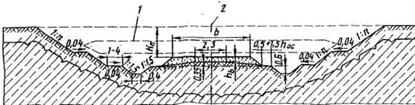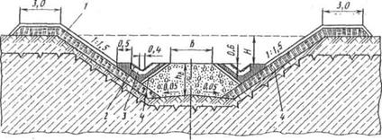 Рис. 4. Поперечный профиль выемки в глинистых грунтах, переходящих при оттаивании в текучепластичное и текучее состояние, с покрытием откосов термоизоляцией: 1 - слой растительного грунта или обсев семенами трав; 2 - слой местного грунта; 3 - укрепление канавы железобетонными плитками или полутрубами; 4 - слой теплоизоляции толщиной, назначаемой по расчету