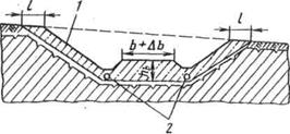 Рис. 5. Поперечный профиль выемки в глинистых грунтах, переходящих при оттаивании в текучепластичное и текучее состояние: 1 - дренирующий, крупнообломочный грунты, в том числе с песчаным и глинистым заполнителем; 2 - дренажная труба; l - толщина слоя, назначаемая по расчету согласно рекомендуемому приложению 8 Величину уширения земляного полотна следует назначать в соответствии с указаниями пп. 3.30-3.32. 3.36. Для обеспечения устойчивости откосов выемок в неустойчивых после оттаивания грунтах (см. п. 3.12) следует предусматривать противодеформационные мероприятия: уположение откосов, назначаемое по результатам расчетов (рекомендуемое приложение 9), или покрытие откосов теплоизолирующим материалом; осушение грунта по мере его оттаивания при образовании деятельного слоя (посредством устройства откосного и присыпного дренажа, покрытия откосов крупнообломочными или песчаными хорошо дренирующими грунтами, укладкой трубо-фильтров и т. п.); устройство закюветных полок шириной от 2 до 4 м. Выбор одного или комплекса мероприятий должен быть обоснован результатами расчетов и данными технико-экономического сравнения вариантов.