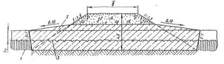 Рис. 3. Поперечный профиль выемки в тугопластичных и мягкопластичных глинистых грунтах: 1 - дренирующий грунт; 2 - глинистый грунт; 3 - поверхность вечномерзлого грунта после образования деятельного слоя по периметру выемки; Нп - глубина выемки по продольному профилю; Hр - глубина выемки с учетом величины вырезки Hв слабого грунта основания, назначаемой по расчету согласно рекомендуемому приложению 7; ho.-величина осадки оттаивающего грунта основания при образовании деятельного слоя по периметру выемки В проектах необходимо указывать, что удаление слабого грунта из основания земляного полотна следует осуществлять в период производства основных работ путем соответствующего увеличения глубины выемки (рис. 3-5) или посредством разработки траншеи в пределах основной площадки земляного полотна (рис. 6) с установкой лотков противопучинной конструкции. 3.35. Толщину слоя дренирующего материала hг., потребного для замены грунта основания, имеющего недостаточную несущую способность, следует определять по формуле: