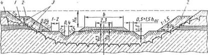 Рис. 9. Поперечный профиль выемки, прорезающий слой подземного льда: 1 - откос не круче 1 : 1,5; 2 - грунт замены; 3 - расстояние до поверхности слоя льда (не менее двойной глубины оттаивания грунта замены); 4 - лед 3.45. При залегании слоя льда ниже бровки земляного полотна или дна кювета на глубине, меньшей или равной расчетной мощности деятельного слоя, необходимого предусматривать удаление льда и замену его местным грунтом, удовлетворяющим требованиям СН 449-72; слой льда, залегающий ниже бровки земляного полотна или дна кювета на глубине, большей расчетной мощности деятельного слоя, разрешается не удалять; в таких случаях необходимо предусматривать уширение земляного полотна на величину, устанавливаемую на основе анализа результатов осуществления подобных решений в аналогичных мерзлотно-грунтовых условиях или на основе данных опытного строительства; для обеспечения устойчивости откосов необходимо предусматривать мероприятия в соответствии с указаниями п. 3.36. При залегании подземного льда ниже дна кювета на глубине более двукратной величины оттаивания грунтов, слагающих дно выемки, вырезку льда производить не следует. 3.46. Выемки, прорезающие водоносные горизонты, следует при необходимости ограждать дренажными сооружениями или противоналедными устройствами согласно пп. 3.56-3.58. 3.47. На косогорах круче 1:5, сложенных грунтами, теряющими устойчивость при оттаивании, планировку бермы между подошвой откоса насыпи и водоотводной канавой следует предусматривать только за счет подсыпки грунтом. Водоотводные и противоналедные мероприятия и устройства3.48. На участках, сложенных вечномерзлыми грунтами, сохраняющими устойчивость в откосах при оттаивании (см. п. 3.12), водоотводные устройства следует проектировать согласно СНиП II-39-76. 3.49. В пределах наледных участков водоотводные устройства следует проектировать в комплексе с противоналедными мероприятиями согласно положениям пп. 3.56-3.58. 3.50. Нагорные и водоотводные канавы в местностях с большими снежными заносами следует размещать с учетом отложений снега около снегозащитных устройств. При необходимости следует проектировать вторую нагорную или водоотводную канавы, располагаемые за пределами контуров снеговых валов. 3.51. Для отвода поверхностной воды на марях следует предусматривать устройство водоотводных канав, размещаемых на расстоянии 5-10 м от подошвы насыпи. Водоотводные канавы следует проектировать с продольным уклоном не менее 0,004 на моховой и не менее 0,002 на кочковатой мари, шириной по низу не менее 0,8 м после их укрепления, глубиной не менее 0,6 м от низа кочек. В пределах участков, где требуемый продольный уклон канав не может быть обеспечен или устройство продольных канав может привести к возникновению термокарстового процесса, следует предусматривать поперечный пропуск поверхностной воды посредством фильтрующих насыпей, дренирующих прорезей или других водопропускных сооружений, располагаемых в местах пересечения местных понижений или полос стока, по которым в естественных условиях происходит сосредоточенный сток поверхностной воды (см. обязательное приложение 10 и рекомендуемое приложение 11). 3.52. В глубоких выемках, в пределах участков с наличием грунтовых вод и грунтов с большим содержанием льда, на марях и торфяниках в случаях, когда оползание откосов и заплывани