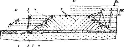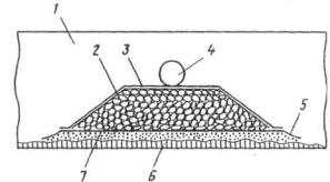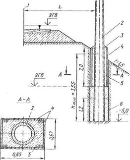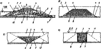 1 См. табл. 1. 3.221. На благоприятных участках следует устанавливать типовые фундаменты и опоры с учетом указаний пп. 3.214, 3.218. 3.222. На условно-благоприятных и неблагоприятных участках необходимо применять: при низком уровне грунтовых вод - фундаменты с ограждением из твердых материалов или геотекстиля (рис. 10);