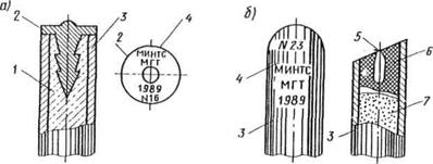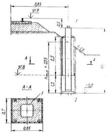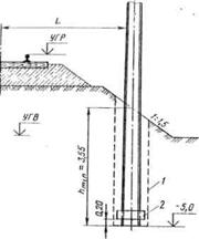 Рис. 13. Схема размещения и закрепления фундаментов опор на участках с особо неблагоприятными мерзлотно-грунтовыми условиями: 1 - фундамент; 2 - анкерная плита 3.224. Па особо неблагоприятных участках следует применять фундаменты по индивидуальным проектам, согласованным с ЦНИИС и ЦУЭП. 3.225. Установку опор фидерных и высоковольтно-сигнальных линий за пределами земляного полотна следует проектировать с учетом положений пп. 3.220-3.224; при этом на марях и заболоченных местах, а также в местах с близким от дневной поверхности залеганием скальных пород допускается, устанавливать опоры в ряжевых основаниях. 3.226. Расчет фундаментов следует выполнять согласно ВСН 141-84 на действие горизонтальной нагрузки с учетом; состояния грунта в летнее и зимнее время. При этом необходимо учитывать горизонтальную составляющую силы морозного пучения грунта в пределах откосов земляного полотна: и естественных косогоров с углом наклона более 20°. 3.227. Противопучинные мероприятия следует назначать в соответствии с п. 3.144. Устройства сигнализации, централизации и блокировки3.228. Устройства сигнализации, централизации и блокировки (СЦБ) на перегонах и станциях следует проектировать в соответствии со СНиП II-39-76 и Ведомственными нормами технологического проектирования ВНТП/МПС-85. 3.229. При проектировании полуавтоматической блокировки не допускается использовать землю в качестве обратного провода. 3.230. Кабельные линии устройств СЦБ на станциях следует прокладывать, как правило, по обочине путей или в междупутье. 3.233. На участках с опасными в отношении морозного пучения и трещинообразования мерзлотно-грунтовыми и гидрологическими условиями допускается размещать кабели в бермах земляного полотна, а при отсутствии берм - по обочине полотна или в междупутье, с заглублением кабеля в грунт на 0,7 м и устройством песчаной подушки и засыпки по согласованию с Министерством путей сообщения СССР. В пределах участков с высоким уровнем грунтовых вод, подтопления и деформирующихся берм необходимо применять кабели с проволочной броней по согласованию с Заказчиком. 3.236. Прокладку кабелей в пределах земляного полотна на участках со слабыми и просадочными основаниями (см. табл. 1) целесообразно осуществлять после стабилизации температурного режима вечномерзлых грунтов основания. размещение вводов на глубине прокладки кабелей; заполнение приямка для ввода кабелей непучинистым грунтом (крупнозернистым песком, гравийно-галечным грунтом и т. п.) с устройством ограждения и отвода поверхностных вод, предотвращающих заиливание дренирующей засыпки; устройство у места ввода грунтовых отсыпок, теплоизолирующих подушек из шлака, пенопласта и других теплоизоляционных материалов. 3.238. Светофоры, релейные шкафы, батарейные шкафы и другое оборудование СЦБ следует располагать как правило, в пределах земляного полотна. В случаях установки этого оборудования вне земляного полотна в местах со сложными мерзлотно-грунтовыми условиями необходимо предусматривать мероприятия, направленные на обеспечение надежности работы устройств СЦБ. 3.239. В качестве основного типа светофорных мачт следует, как правило, применять железобетонные мачты. Металлические светофорные мачты допускается применять при соответствующем технико-экономическом обосновании. Светофорные железобетонные мачты, б