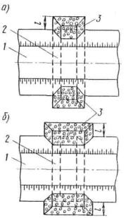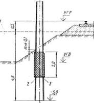 Рис. 12. Схема установки опоры контактной сети с противопучинной обмоткой: 1 - уровень условного обреэа фундамента; 2 - хомут (скрутка); 3 - обмотка (3 слоя полиэтилена и 3 слоя несмерзающейся смазки, например ЦИАТИМ 201)