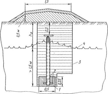 Рис. 10. Схема размещения и закрепления фундаментов опор на участках с условно-благоприятными мерзлотно-грунтовымн условиями (см. табл. 6): 1 - ось пути; 2 - опора; 3 - слив; 4 - короб или геотекстиль; 5 - дренирующий грунт; 6-местный грунт; 7.-расстояние по габариту; УГР - уровень головки рельса; УГВ - уровень грунтовых вод (размеры в м) при высоком уровне грунтовых вод - фундаменты с анкерными плитами (рис. 11); в сильно обводненных грунтах - фундаменты прямоугольного или круглого сечения с противопучинной полиэтиленовой обмоткой и с несмерзающейся смазкой (рис. 12). 3.223. Для крепления оттяжек анкерных опор следует применять стоечные грибовидные анкеры с засыпкой верхней 2/3 глубины котлована дренирующим грунтом, огражденным коробом (рис. 13) или изоляцией верхних 2/3 части стойки анкера полиэтиленовой противопучинной обмоткой.